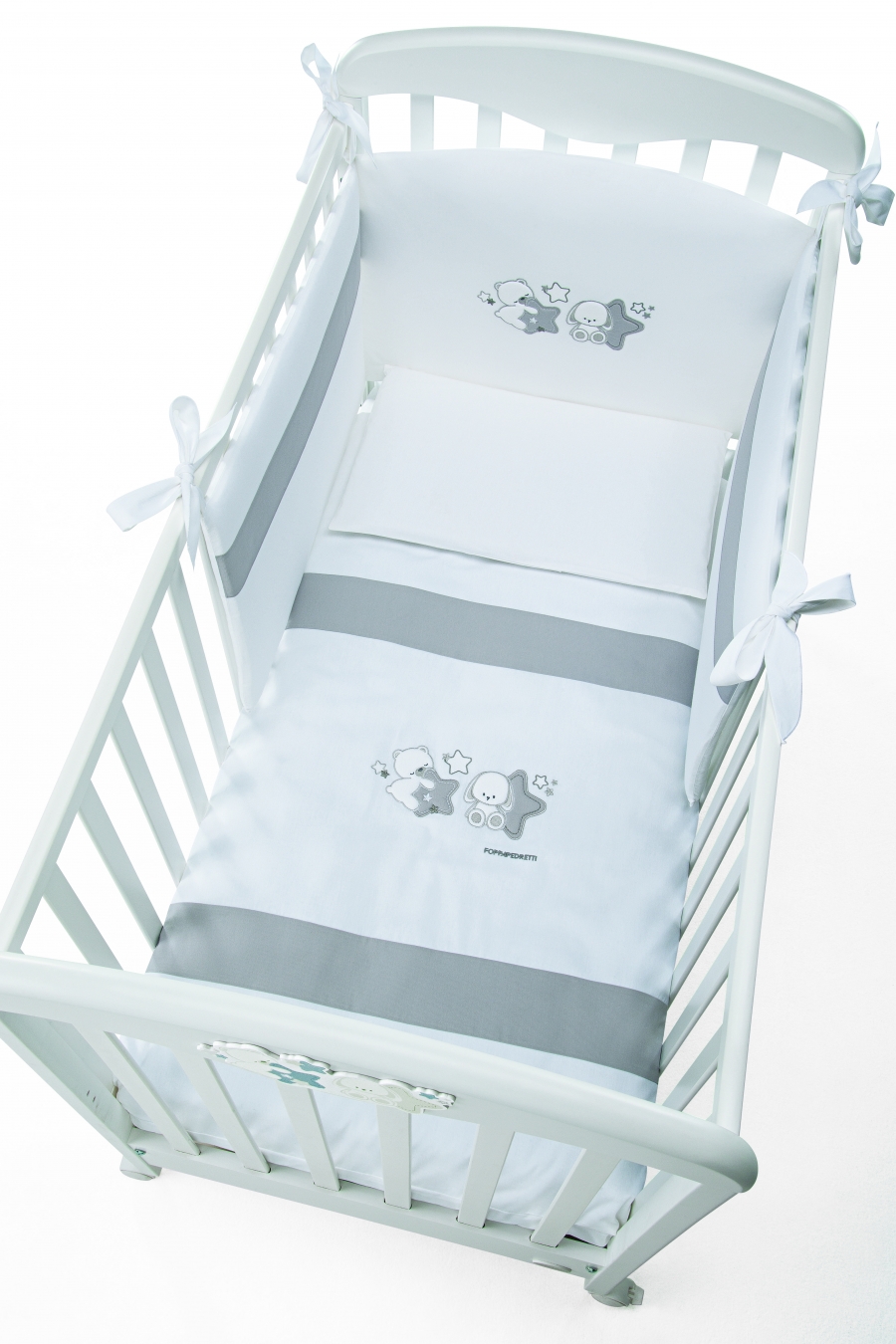 Il completo piumone Piccoli amici di Foppapedretti è caratterizzato da ricami con due piccoli amici: un dolcissimo coniglietto e un simpatico orsetto che giocano con alcune stelline, nelle tinte del grigio. Il set tessile è composto da paracolpi con imbottitura in poliestere 100% e rivestimento in cotone 100%, sacco sfoderabile in cotone 100% e imbottitura in poliestere 100% e federa per cuscino in cotone 100%.