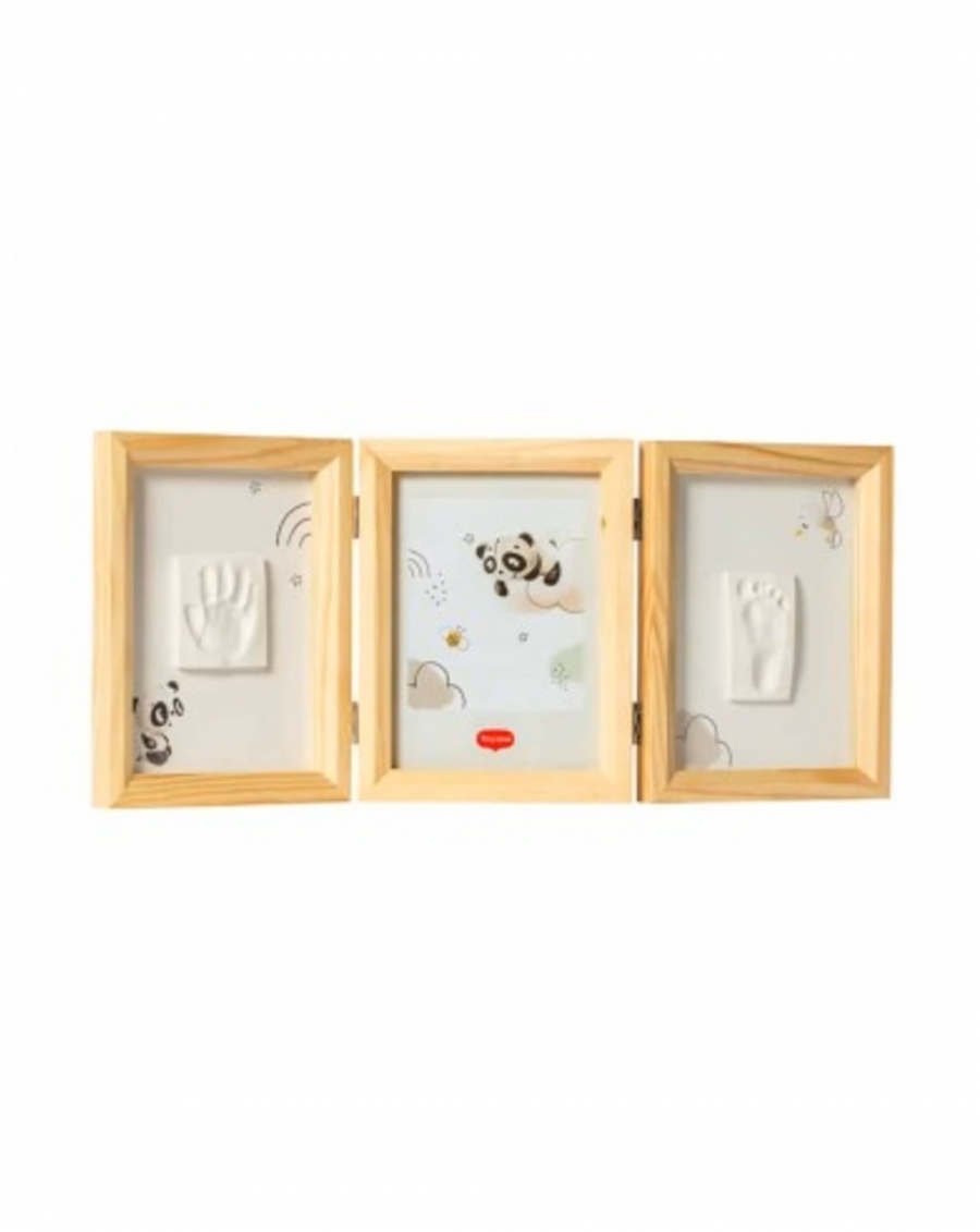Cornice a tre sconparti due porta impronta di mani e piedino con materiale a tossico nella confezione ed uno sconparto porta foto